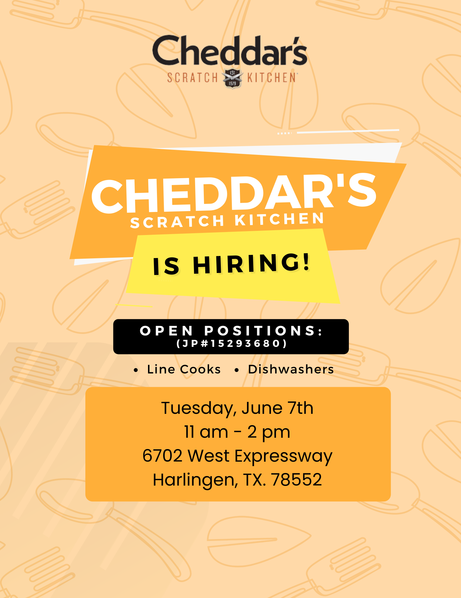 They are currently hiring line cooks and dishwashers. Don’t miss their hiring event scheduled for Tuesday, June 7th from 11am – 2pm at their Harlingen establishment, located at 6702 West Expressway 83.