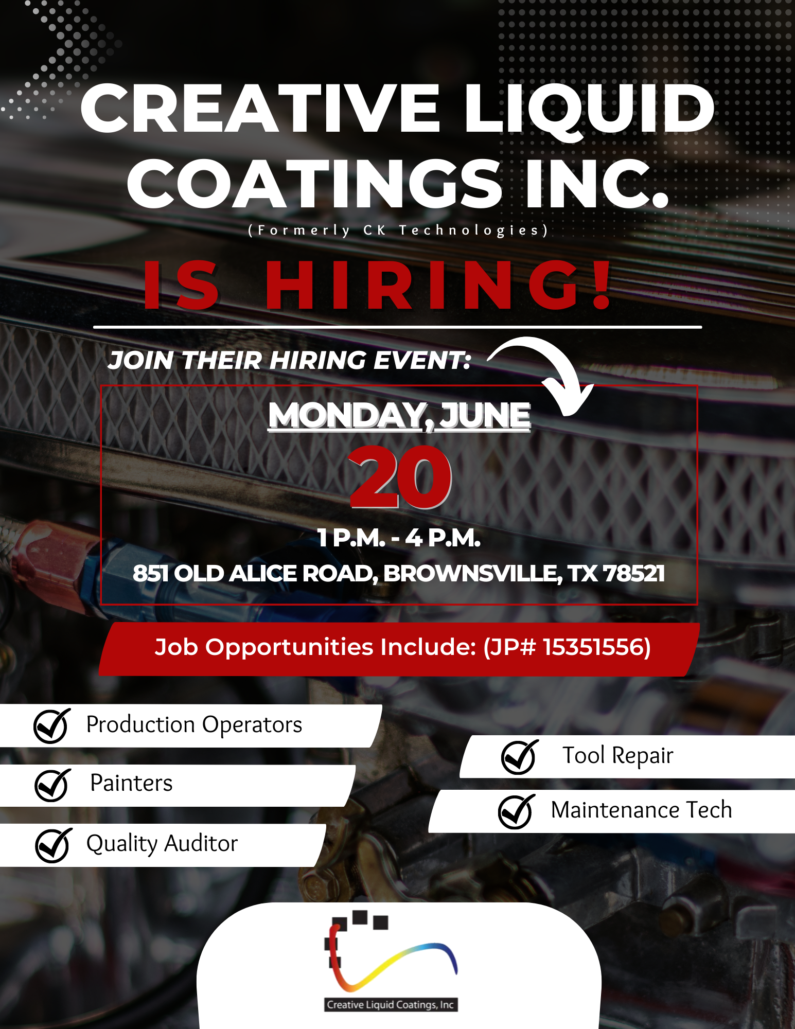 Don’t miss their hiring event scheduled for Monday, June 20th from 1 p.m. to 4 p.m. at our Brownsville Workforce center located at 851 Old Alice Road. Creative Liquid Coatings is hiring production operators, painters, maintenance techs and more!