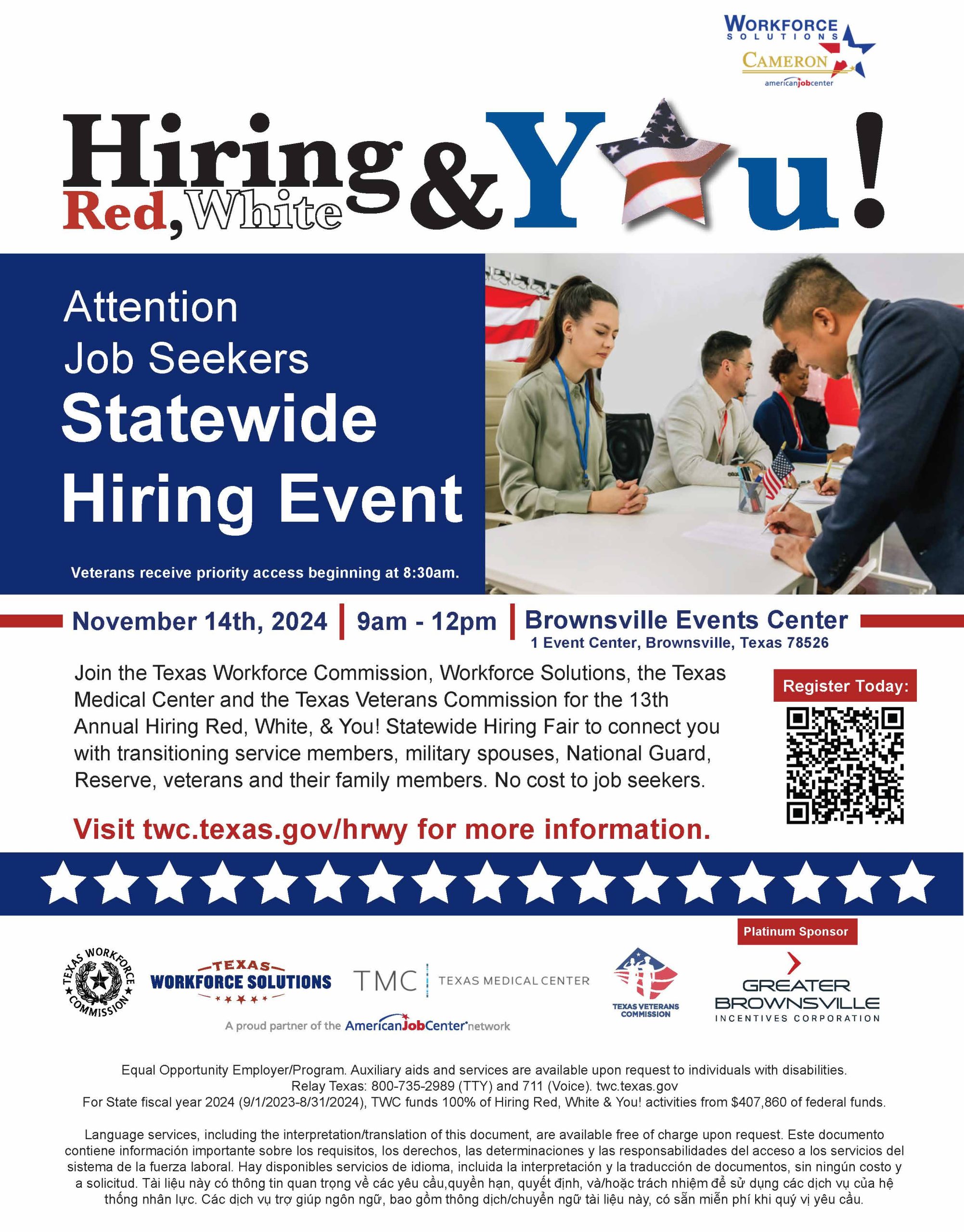 Don’t miss our annual Hiring Red, White & You! Job Fair happening on Thursday, November 14th from 9am – 12pm at the Brownsville Events Center.