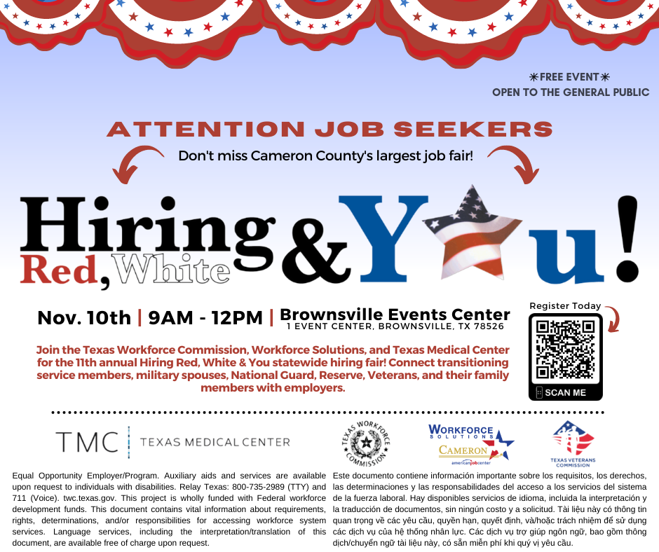 Our annual Hiring Red, White & You Job Fair happening on Thursday, November 10th from 9AM – 12PM at the Brownsville Events Center.
