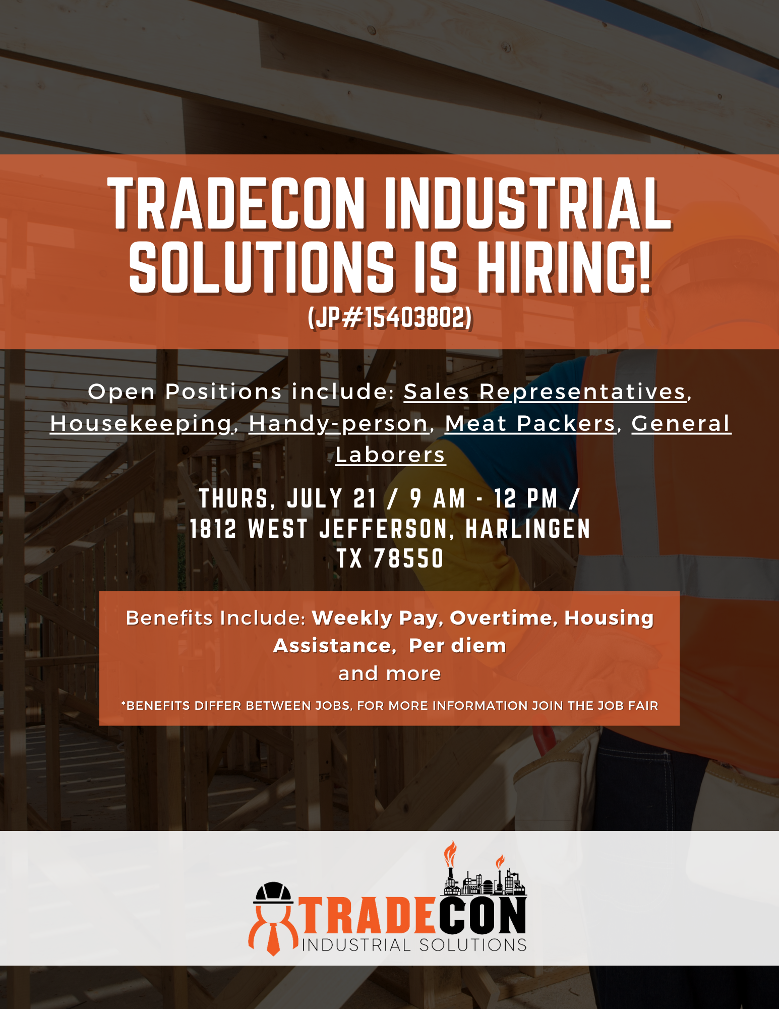 Don’t miss their hiring event happening from 9 a.m. to 12 p.m. on Thursday, July 21 at our Workforce Solutions Cameron Center in Harlingen, located at 1812 West Jefferson Ave.