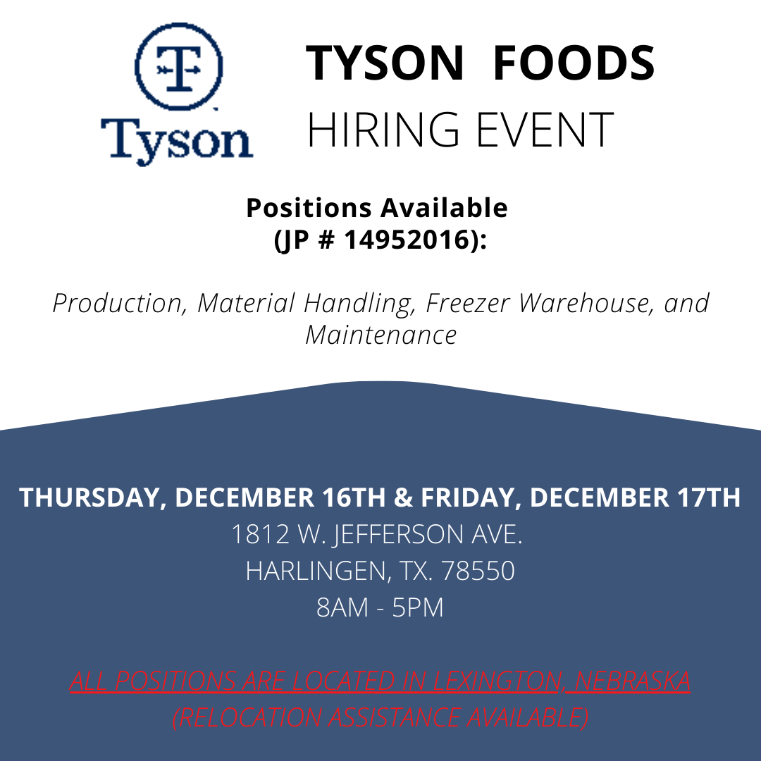 They’ll be hosting a hiring event at our Harlingen office (1812 W. Jefferson Ave) on Thursday, December 16th and Friday, December 17th from 8am – 5pm!