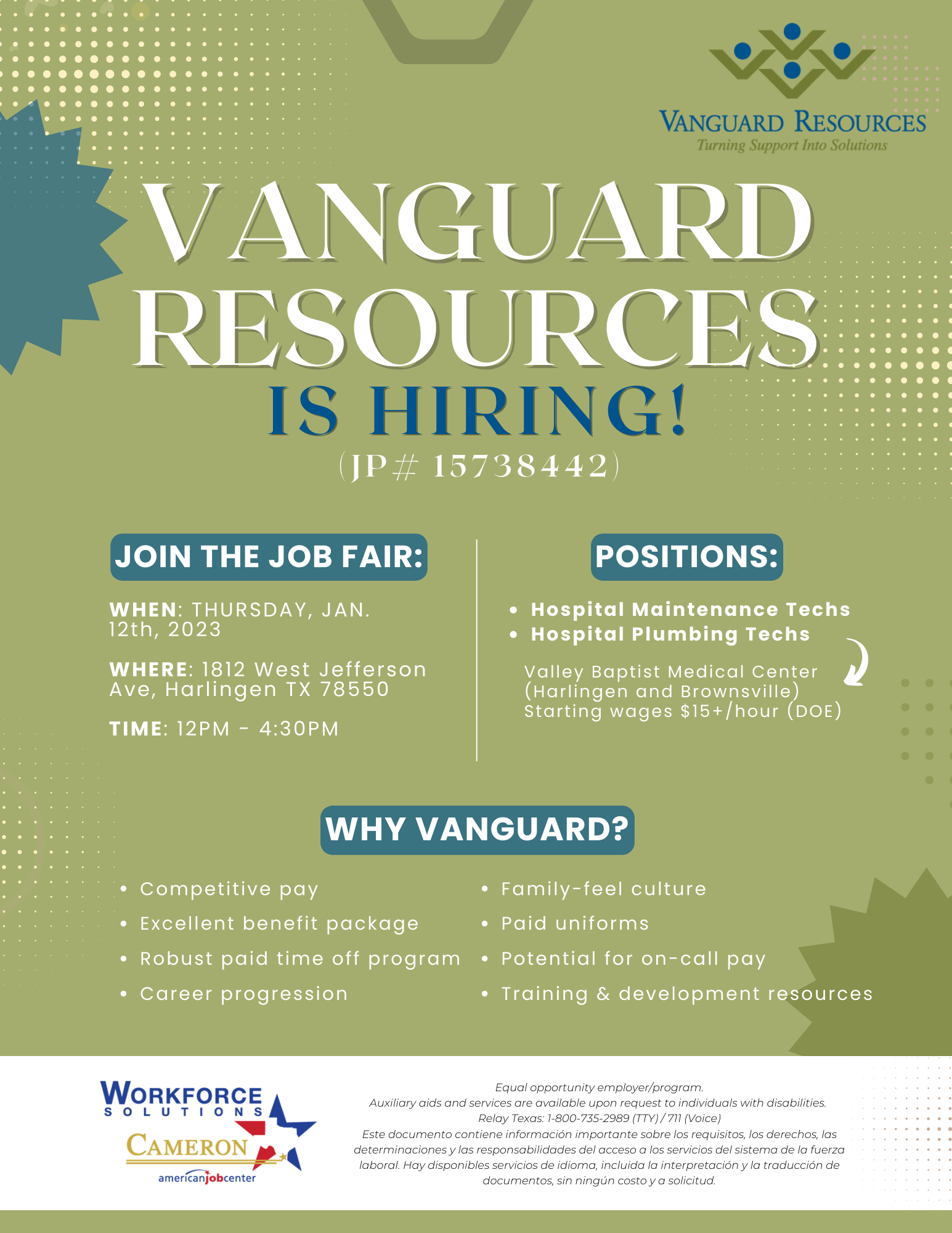 Don’t miss their job fair happening on Jan. 12th at our Workforce Solutions Cameron center in Harlingen, located at 1812 West Jefferson Ave.