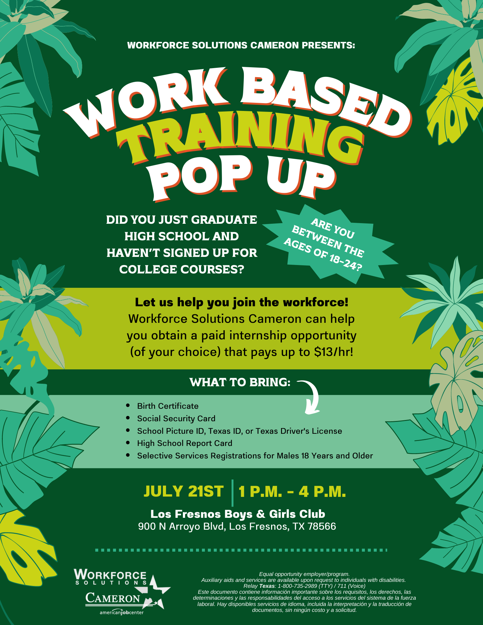 Workforce Solutions Cameron is hosting a Work Based Training Pop-Up event from 1p.m. to 4p.m. on Thursday, July 21 at the Los Fresnos Boys & Girls Club located at 900 N Arroyo Blvd!