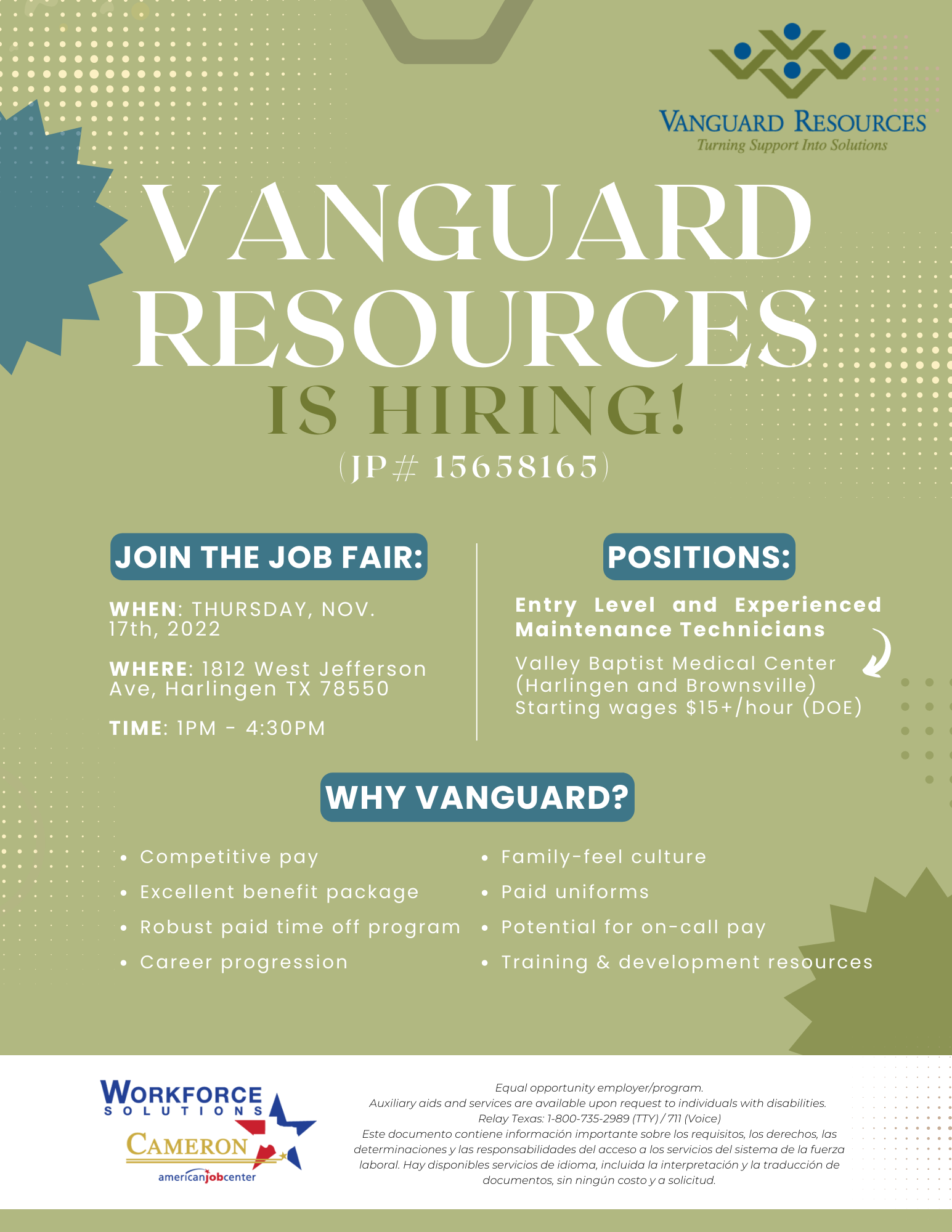 Do you need a job? Vanguard Resources is hiring!   Don't miss their job fair happening Nov. 17th at our Workforce Solutions Cameron center in Harlingen, located at 1812 West Jefferson Ave.   Open positions include: entry level and experience maintenance technicians. No education requirement. Experience is a plus, but not a requirement.   See flyer for more details.