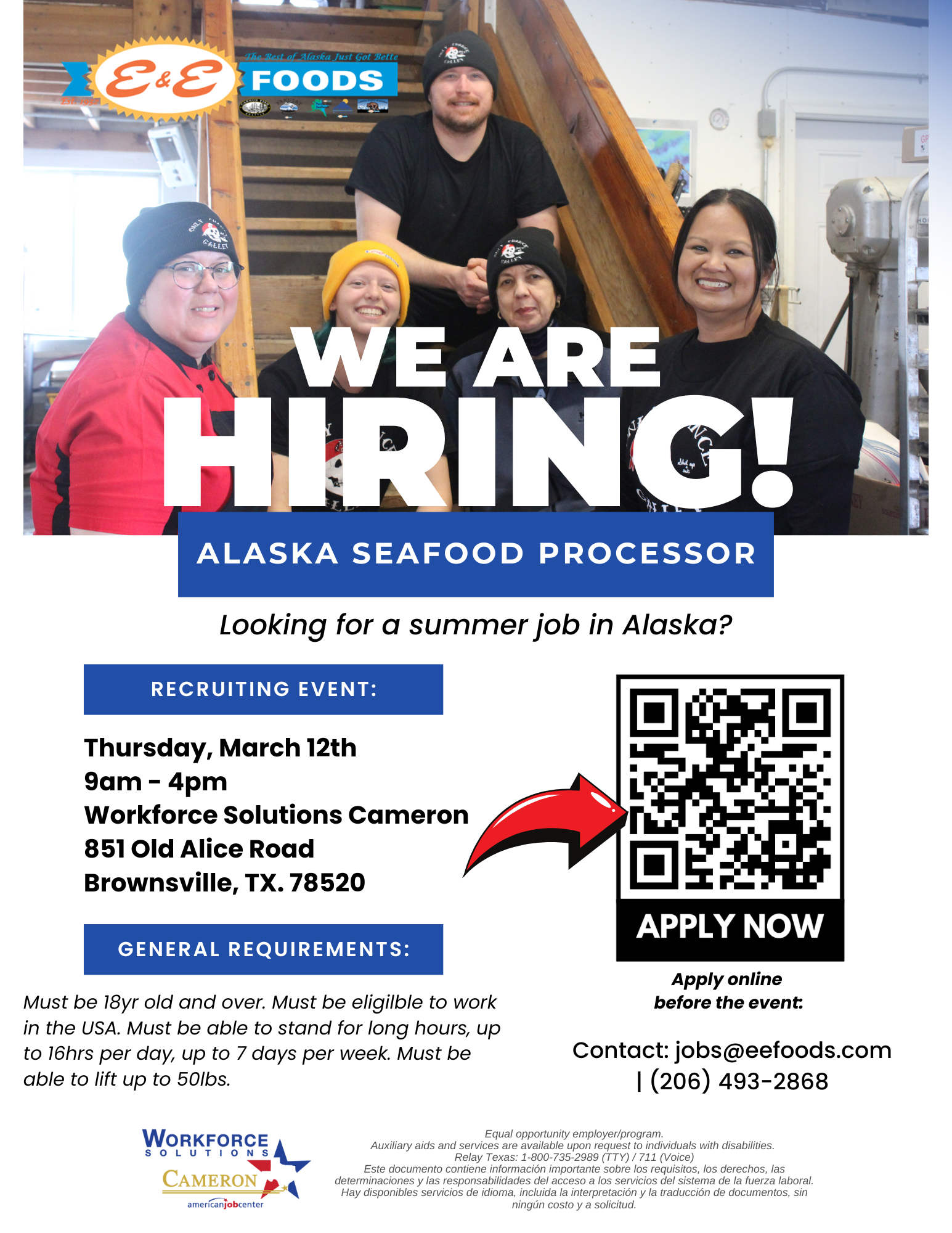 Ready for a new job? E&E Foods is hiring! Don't miss your opportunity to live in Alaska over the summer!   Date: March 12th Time: 9am - 4pm Location: 851 Old Alice Road, Brownsville, TX. 78520 Â
