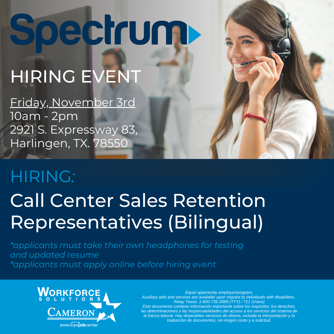 Spectrum is HIRING! Don't miss their hiring event on Friday, November 3rd from 10am - 2pm at their offices located at 2921 S Expressway 83, Harlingen, TX. 78550. They're currently seeking Call Center Sales Retention Representatives (Bilingual). APPLICANTS MUST: Take their own headphones for testing and updated resume. Apply BEFORE the hiring event: https://bit.ly/3tCyRur See you there!