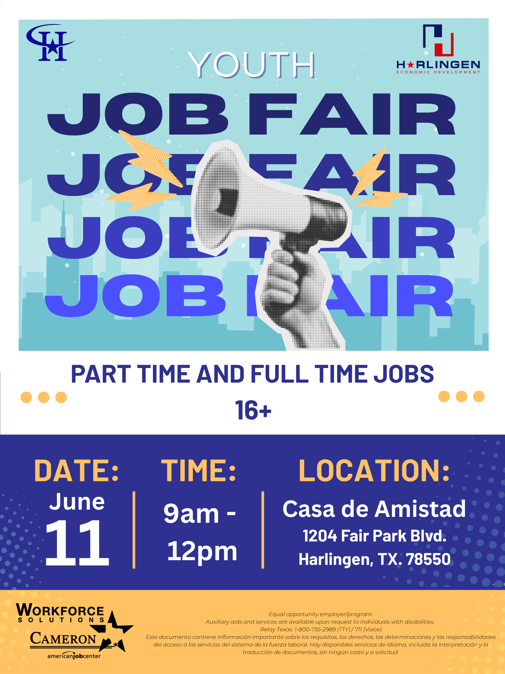 Calling all youth job seekers! Looking for your first job or wanting to switch it up? Join us at our Youth Job Fair and connect with local employers ready to hire! Date: June 11th Time: 9am - 12pm Location: Casa de Amistad, 1204 Fair Park Blvd. Harlingen, TX. 78550 This is your chance to explore job opportunities, meet recruiters, and ... Read More