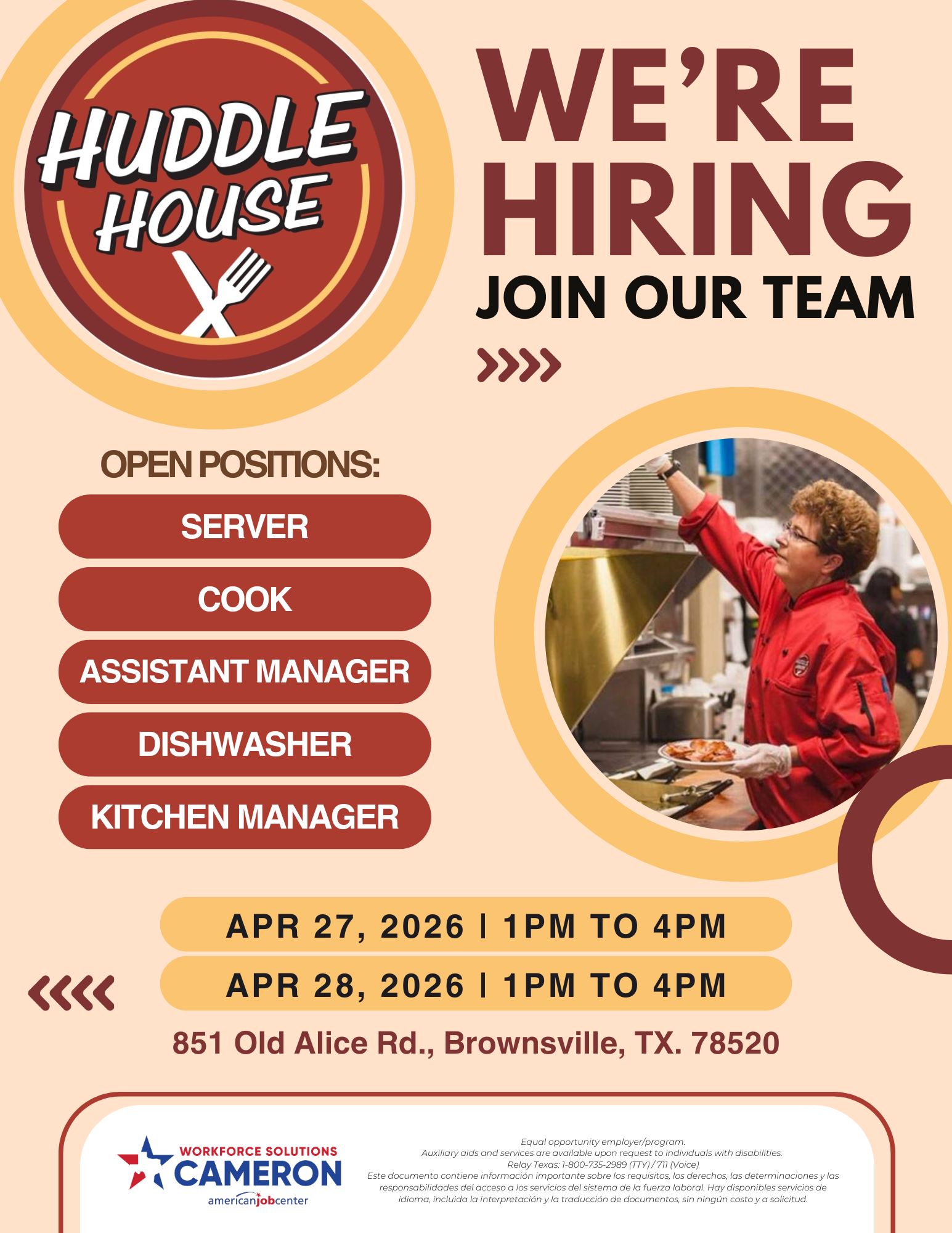 🔥Did you hear? Huddle House is opening in Brownsville! Ready to start your next job? Come meet the team and learn more about employee benefits like 50% off meals and flexible schedules! 📆 April 27th & 28th ⌚ 1pm – 4pm 📍 851 Old Alice Rd., Brownsville, TX. 78520 Don't miss it!