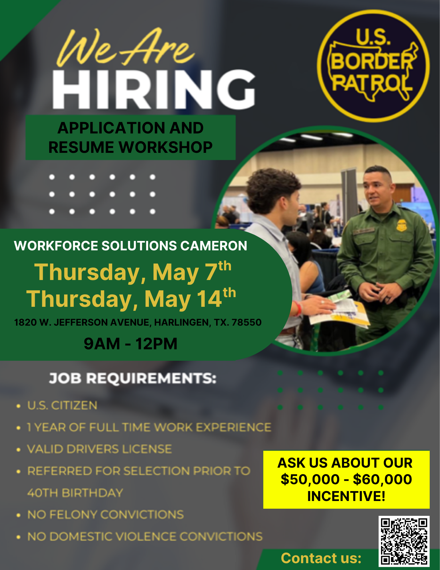 Looking for a career with purpose, adventure, and great benefits? Join the U.S. Border Patrol! Date: May 7th and 14th Time: 9am – 12pm Location: 1820 W. JEFFERSON AVENUE, HARLINGEN, TX. 78550